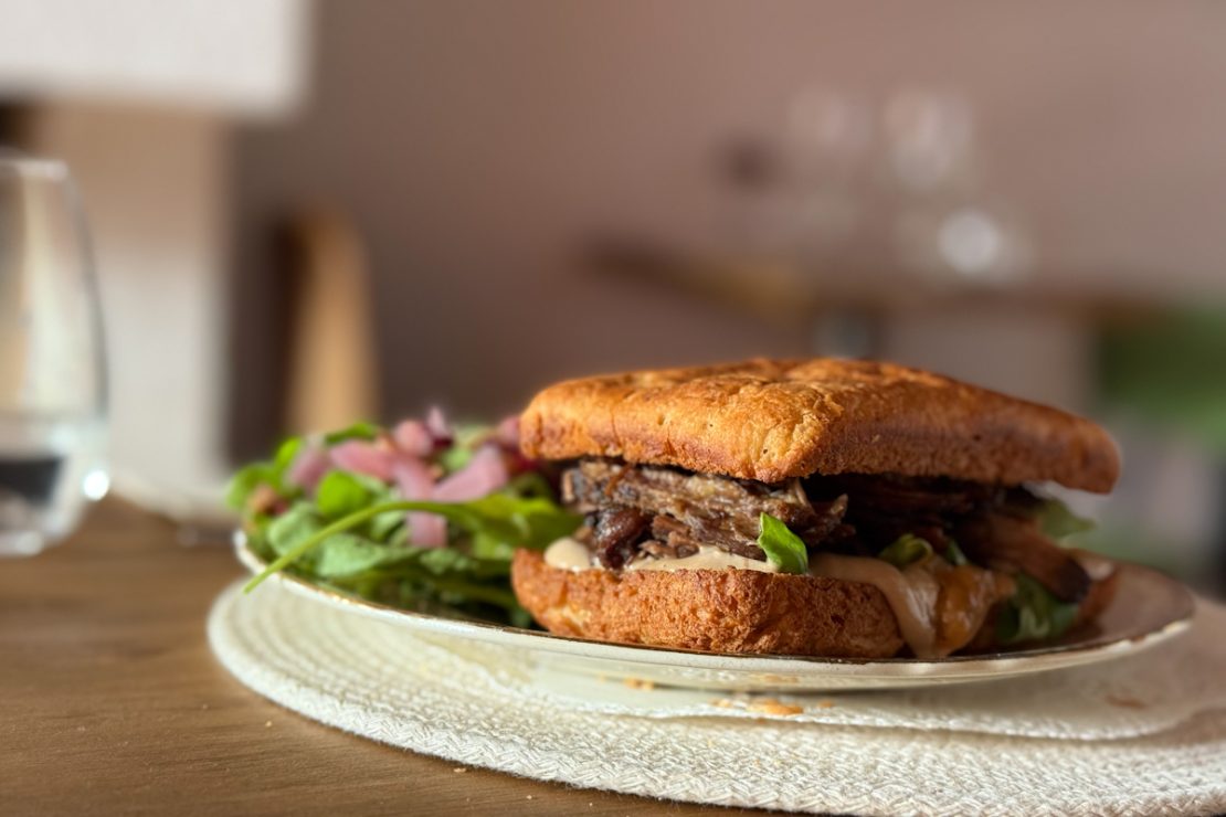 La carta es breve pero contundente. Hay Pizzas como La Soulé (mozzarella, pickles de remolacha, duraznos asados, roquefort y garrapiñada de cajú); entrepanes como “El De La Abuela” que viene en pan brioche y lleva ternera braseada, ajo negro, rúcula y chutney de cebolla, y ensaladas de hojas verdes; o el Vegano con tofu apanado en panko.