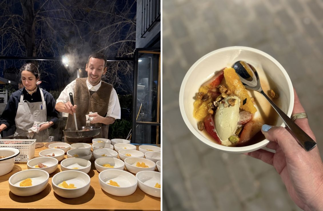 Sopa de cebollas asadas, pan a las brasas, queso cottage de Mauricio Couly, hongos marinados, muhammara, pollo, pickles de naranjas, papas, escalivada, peras asadas con radicchio, lechuga repollada y dressing de menta y eneldo, frutas de estación asadas con helado de pistacho y frutos secos garrapiñados.