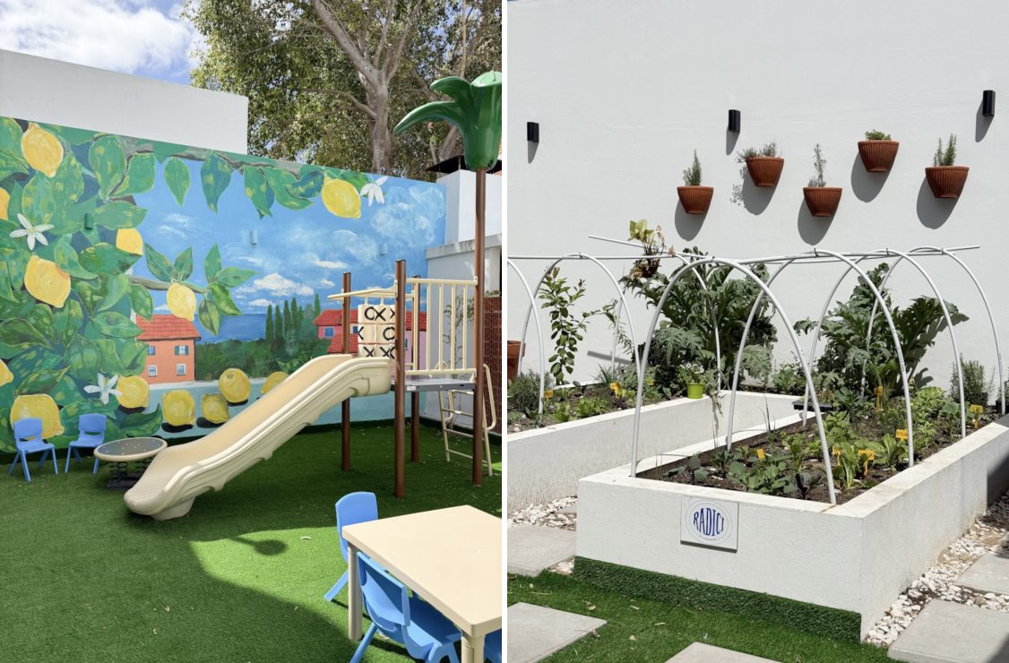 La barra es el corazón del lugar, con la cocina que se deja ver detrás, con acero, tecnología, mármol, más un equipo que lograron armar. Continuando hacia el interior, un patio con techo rebatible de aluminio da la sensación de hogar y que actúa como una antesala hacia el aire libre, un respiro que conecta con el espacio exterior donde encontramos la plaza de juegos con un imponente mural como telón de fondo. En otro sector está la huerta que abastece la cocina, cerrando el ciclo de la experiencia.