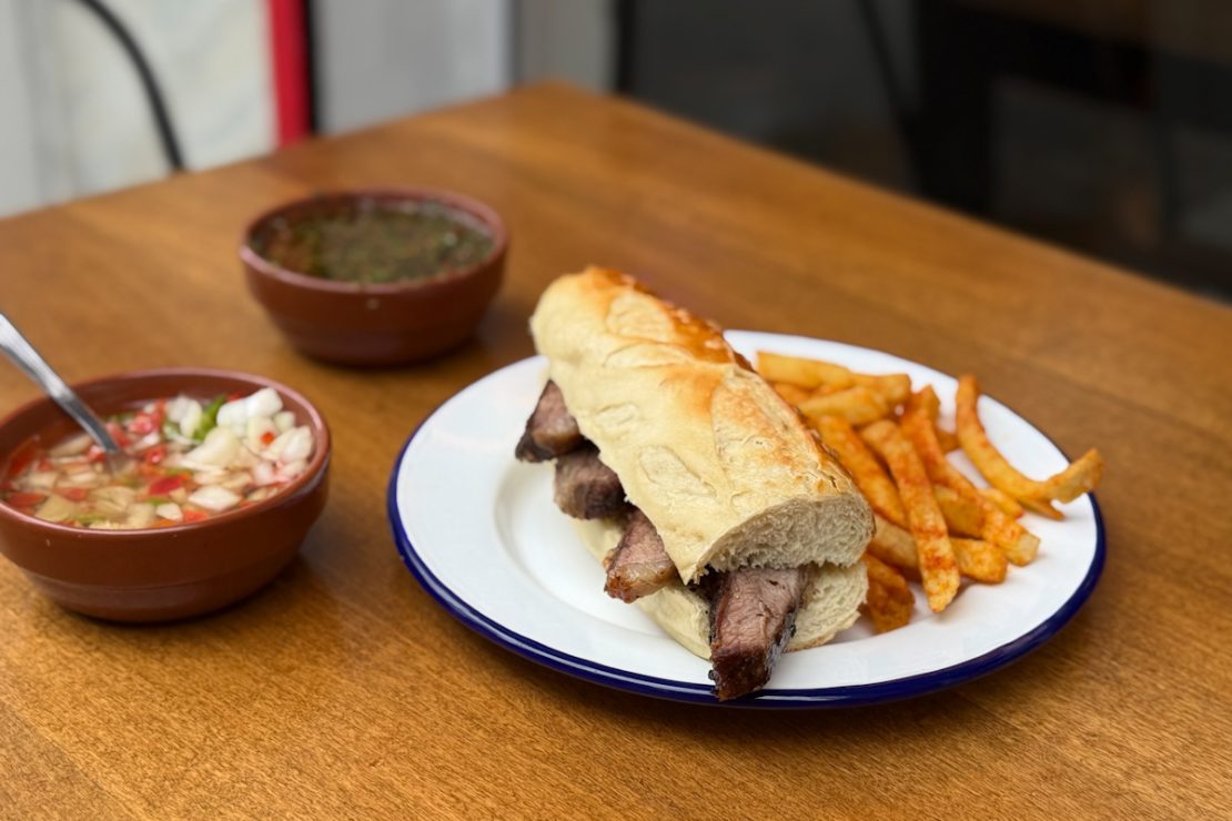El sandwich de vacío es de generoso tamaño. Viene con chimichurri, criolla y papas fritas sazonadas para acompañar.