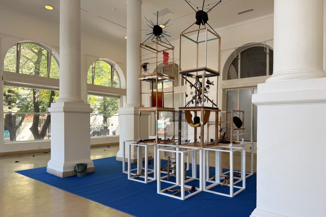 En la instalación del final, propone un mash up entre las estructuras mínimas de Sol Le Wit en la base, las celdas de Giacometti construidas por cubos con figuras dentro en la parte superior y la cruel historia de Pinocho en versión trash.